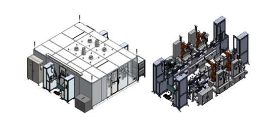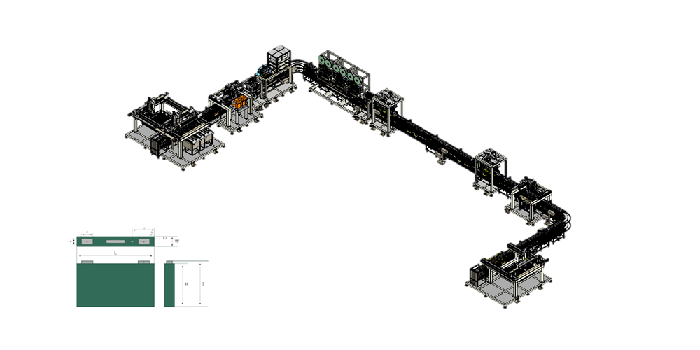 This is a logistics-line facility for secondary batteries (prismatic cells) where empty cells are loaded via pick-and-place (P&P),