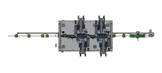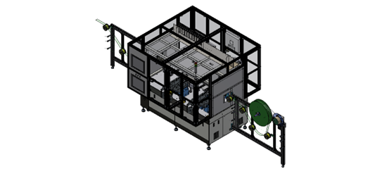 This is a system that attaches tape precisely to the middle‐plate (cathode material) of cylindrical secondary battery cells. The process uses a vision system to accurately position and apply the tape
